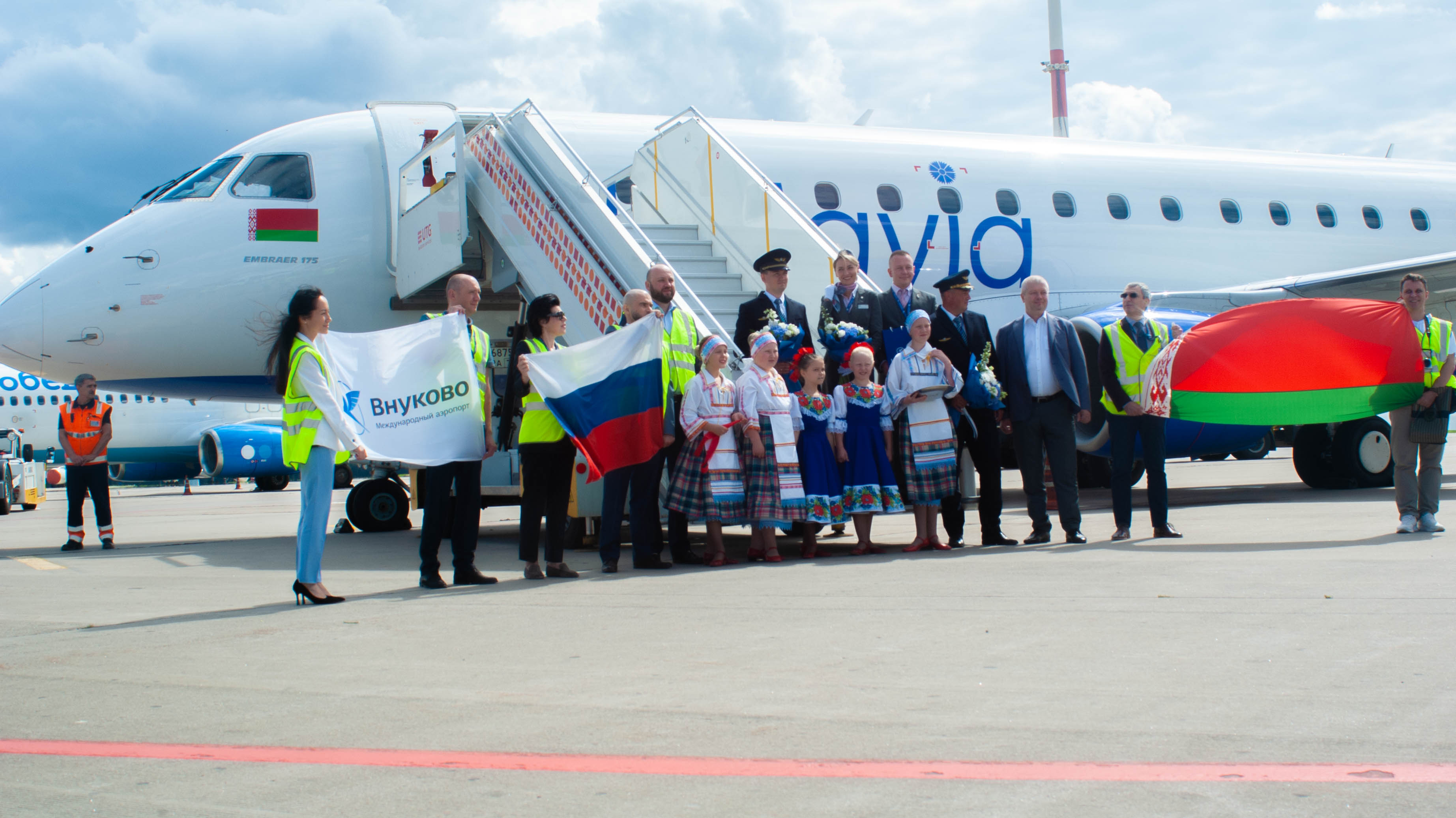 С 15 июля 2022 года авиакомпания «Белавиа» возобновила полеты из Международного аэропорта Внуково в Минск. Воздушное судно, прибывшее из столицы Республики Беларусь, приземлилось в аэропорту Внуково, где его традиционно приветствовали водной аркой. В честь торжественного события – возобновления полетной программы авиакомпании «Белавиа» – была перерезана красная ленточка. В церемонии приняли участие заместитель генерального директора по коммерции АО «Международный аэропорт «Внуково» Антон Кузнецов, заместитель генерального директора по маркетингу и внешнеэкономической деятельности ОАО «Авиакомпания «Белавиа» Владимир Баркун и директор генерального представительства ОАО «Авиакомпания «Белавиа» в РФ Игорь Кирсанов. Пассажирам рейса Москва (Внуково)-Минск были вручены сувениры от аэропорта Внуково. Праздничную атмосферу в этот день создавал ведущий творческий коллектив города Москвы детский хореографический ансамбль «Жемчужина» ОСП КЦ «Внуково» ГБУГ г. Москвы «ОКЦ ЗАО».