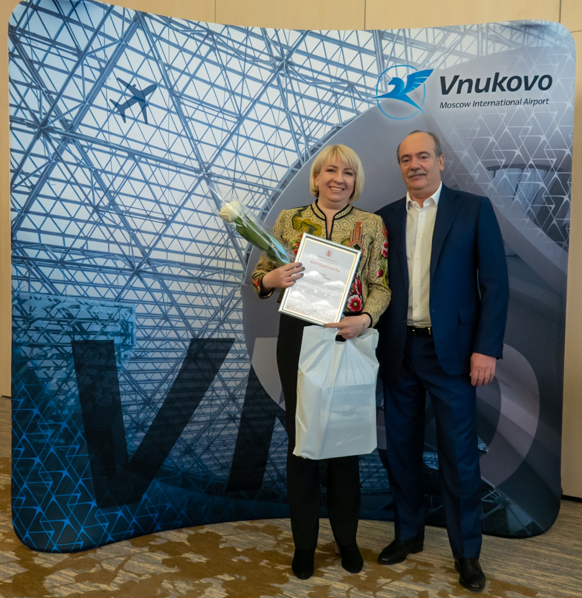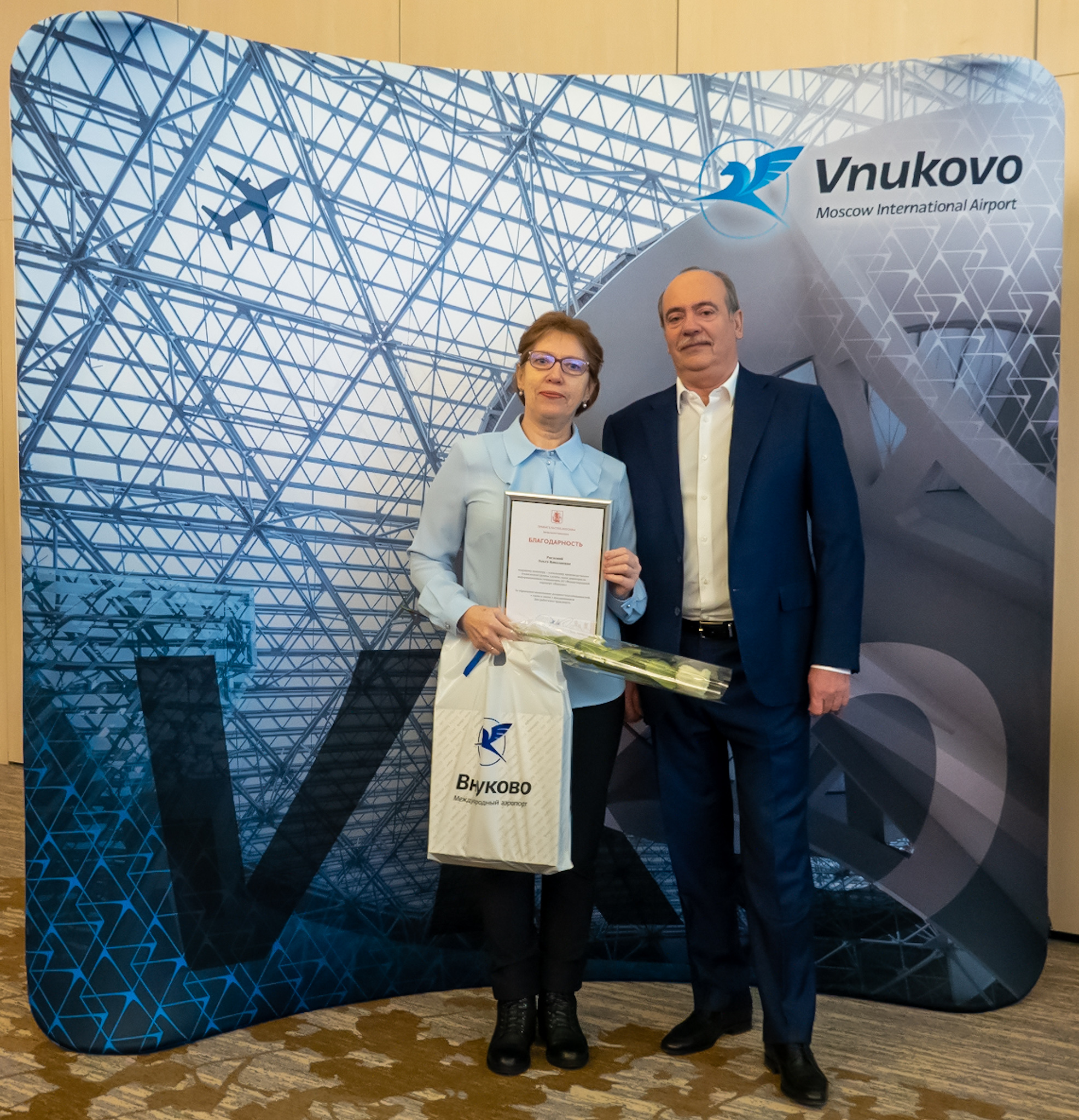 За образцовое выполнение должностных обязанностей благодарности заместителя Мэра Москвы и руководителя Департамента транспорта и развития дорожно-транспортной инфраструктуры г. Москвы получили: Виктор Волков, рабочий по комплексному обслуживанию и ремонту зданий службы эксплуатации; Сергей Голиков, мастер службы тепло- и санитарно-технического обеспечения; Юлия Ежова, начальник группы приема и размещения гостиничного комплекса Внуково; Ирина Каширская, старший диспетчер по организации наземного обслуживания центра управления и координации; Ольга Костина, начальник отдела управления рисками; Ольга Рослова, ведущий инженер-начальник производственно-технической группы службы связи.