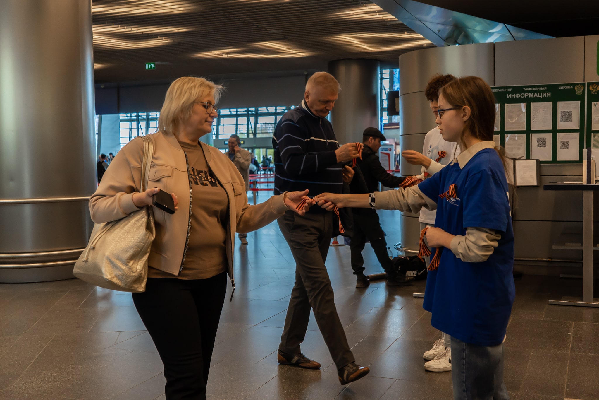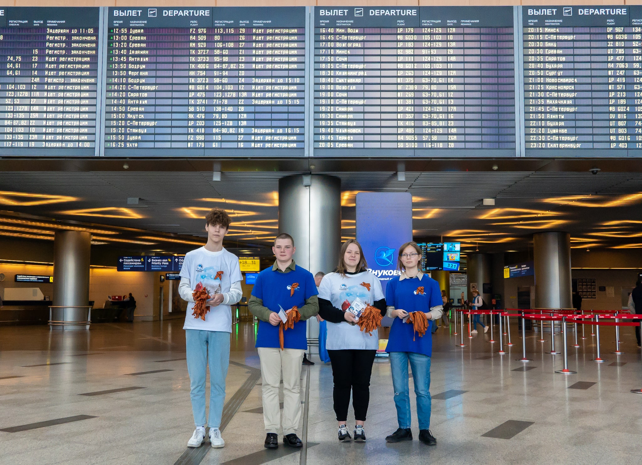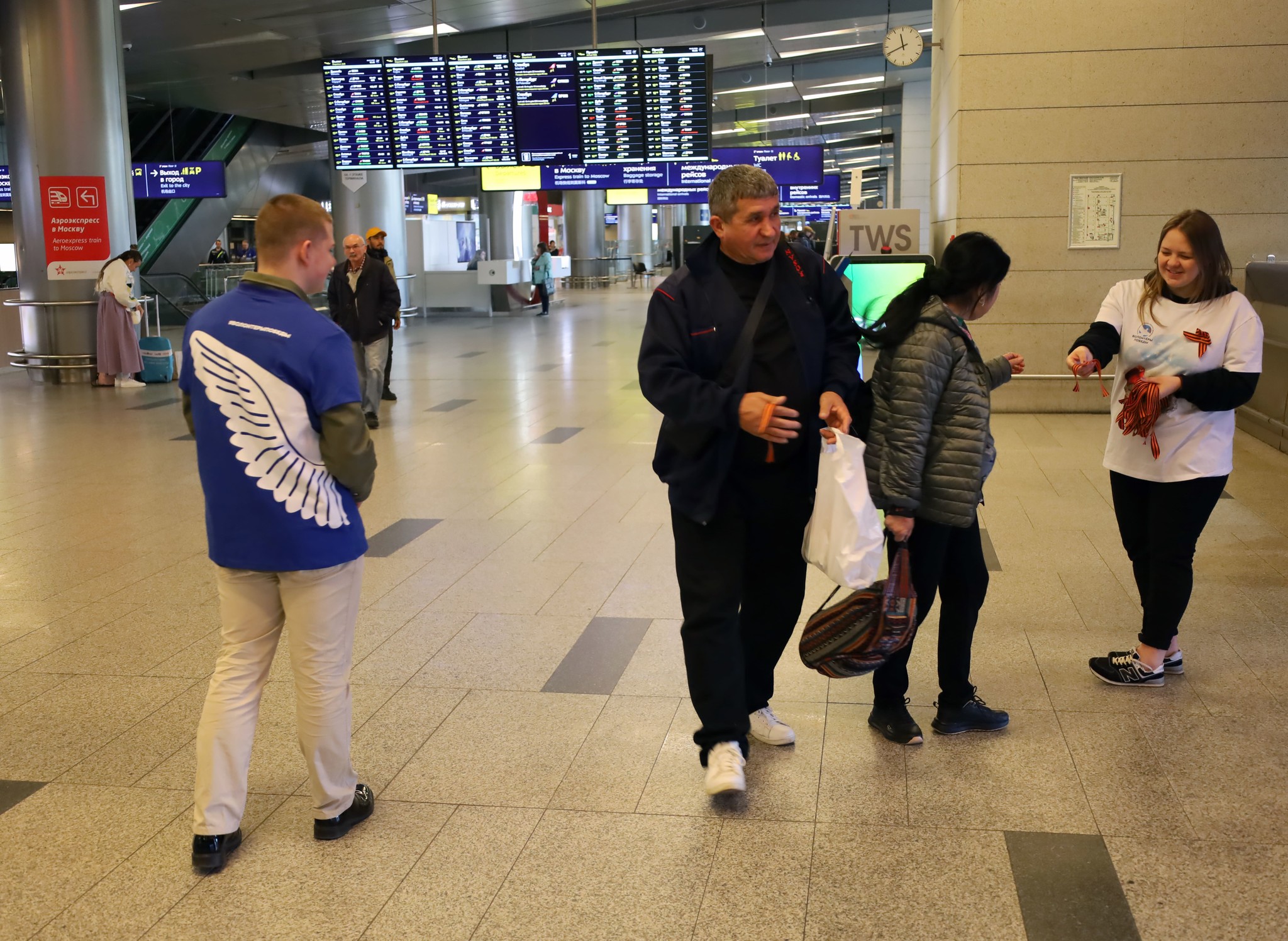 В терминале А сотрудники аэропорта Внуково и представители Всероссийского общественного движения «Волонтеры Победы» раздали всем желающим Георгиевские ленточки.