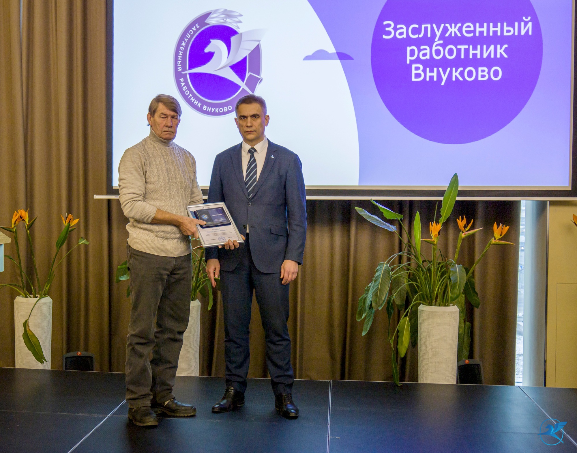 Звание «Заслуженный работник Внуково» было присвоено инженеру дирекции информационных технологий АО «МАВ» Олегу Кустову и трактористу-машинисту аэродромной службы АО «МАВ» Николаю Пехтереву. Награды им вручил генеральный директор ООО «Авиакомпания «Победа» Дмитрий Тыщук. В своем приветственном слове он отметил, что чуть более десяти лет назад именно из Внуково «Победа» совершила свой первый рейс (в Волгоград), и уже долгие годы аэропорт остается базовым для авиакомпании.