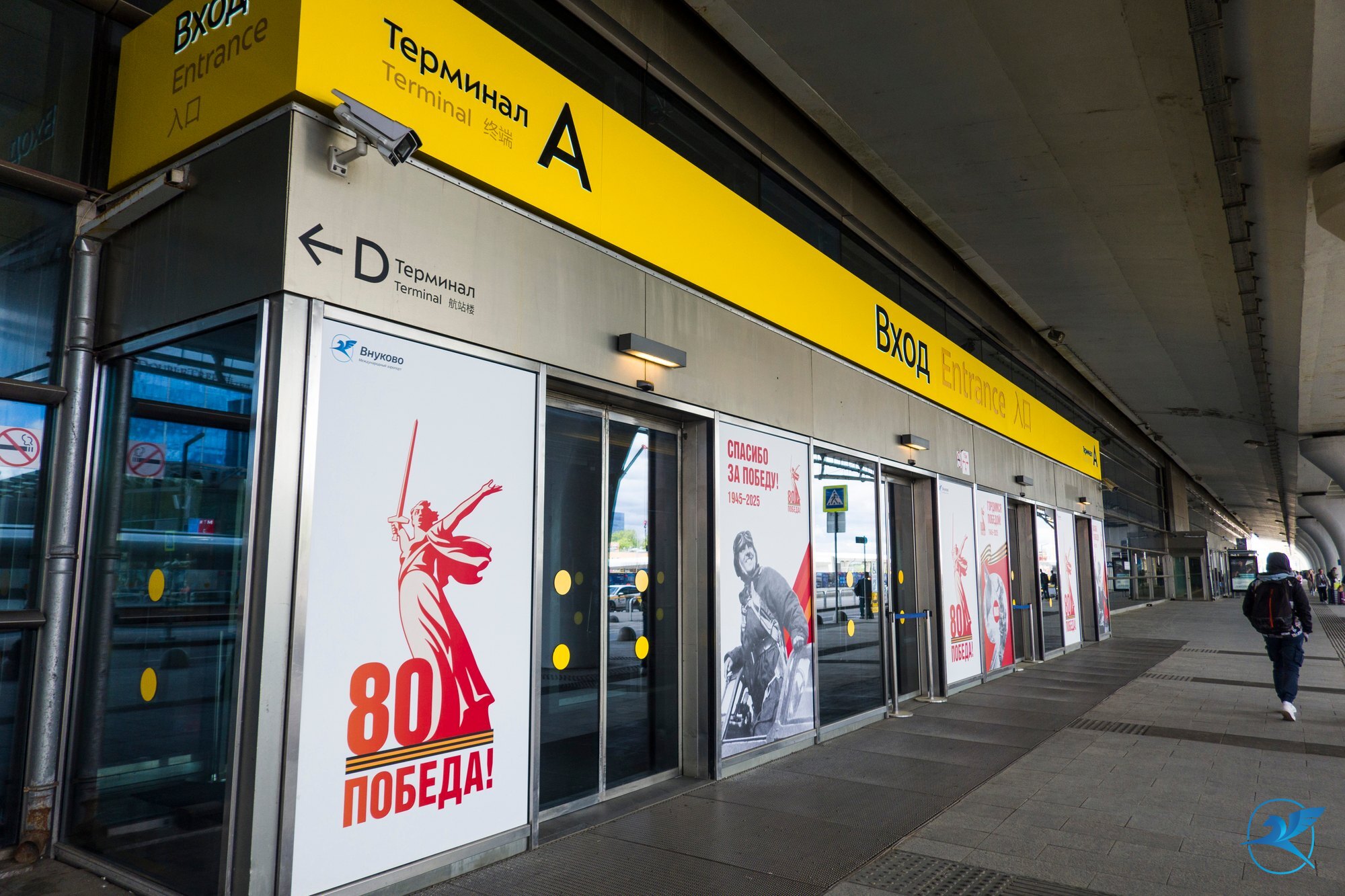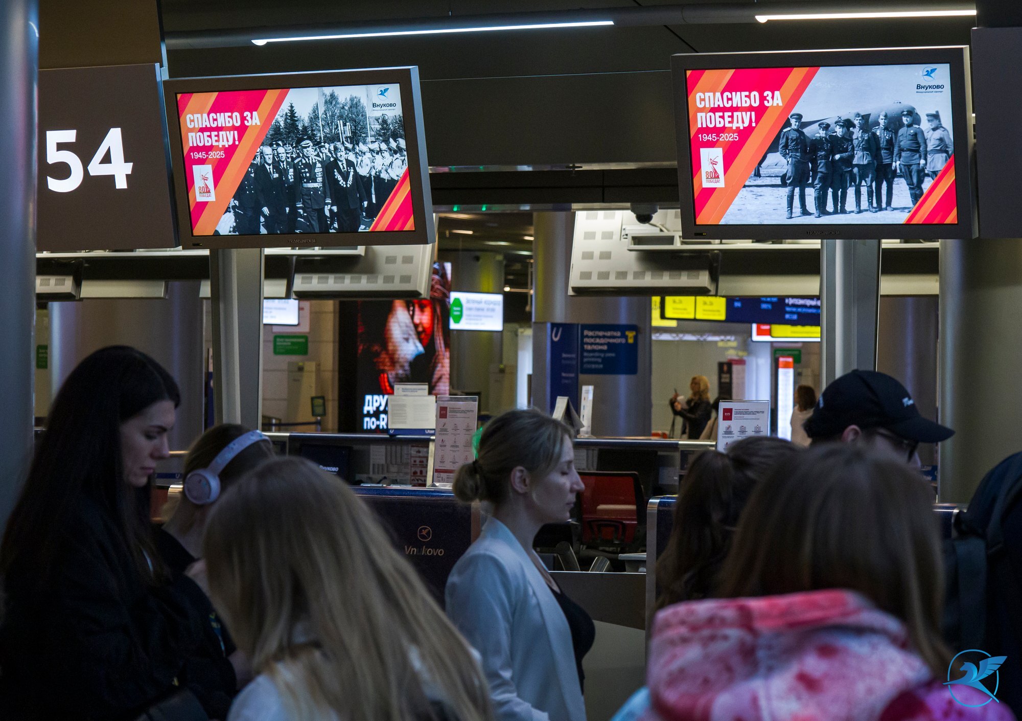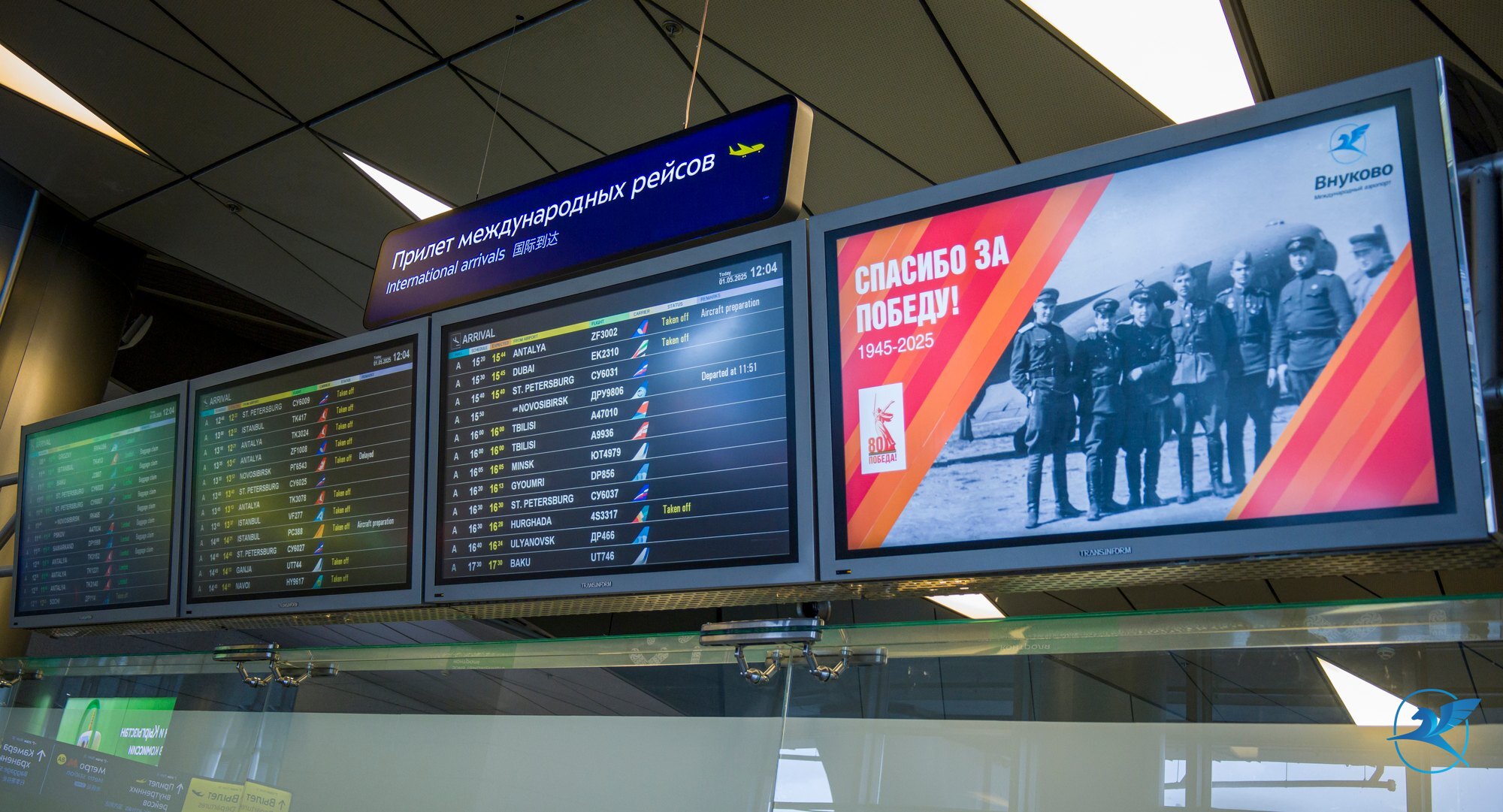 Накануне Дня Победы Международный аэропорт Внуково традиционно встречает пассажиров и гостей праздничным оформлением. На привокзальной площади установлена флаговая конструкция «Факел». Кроме того, торжественно украшены входные группы аэропорта. На мониторах, расположенных в аэровокзальном комплексе, демонстрируются исторические ролики и заставки, по ТВ-сети терминала — видео и фото, посвященные роли транспорта в годы Великой Отечественной войны. В терминале звучат аудио-поздравления. А 9 мая в аэропорту Внуково состоится прямая трансляция парада, который пройдет на Красной площади столицы. Для этого в терминале впервые установили специальный экран размером 3×5 метров.