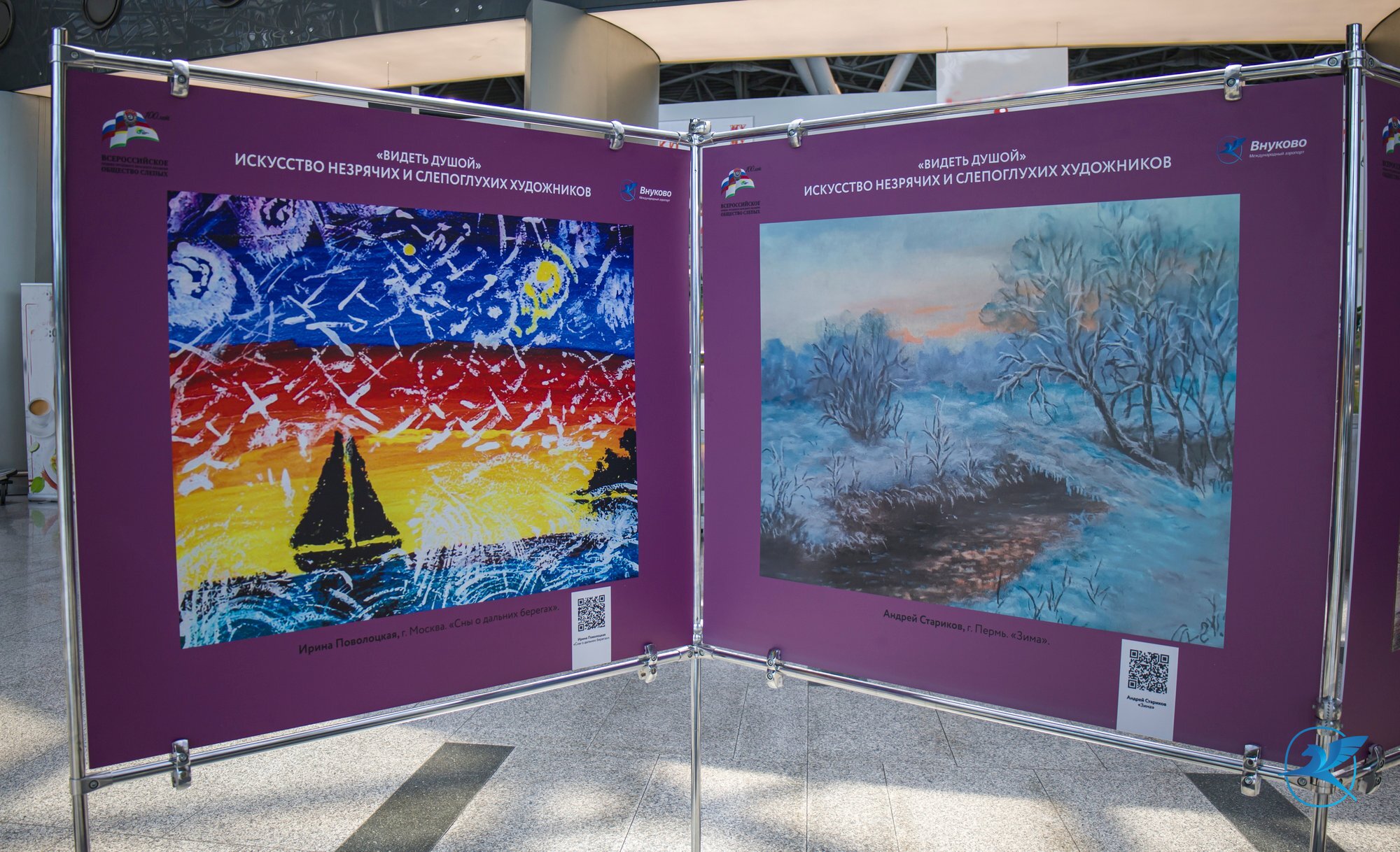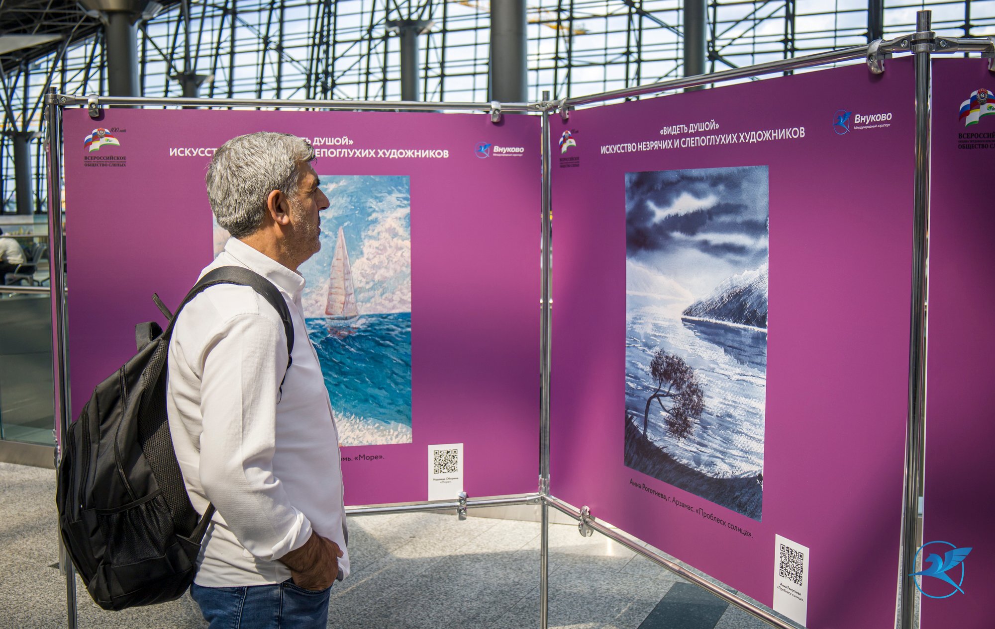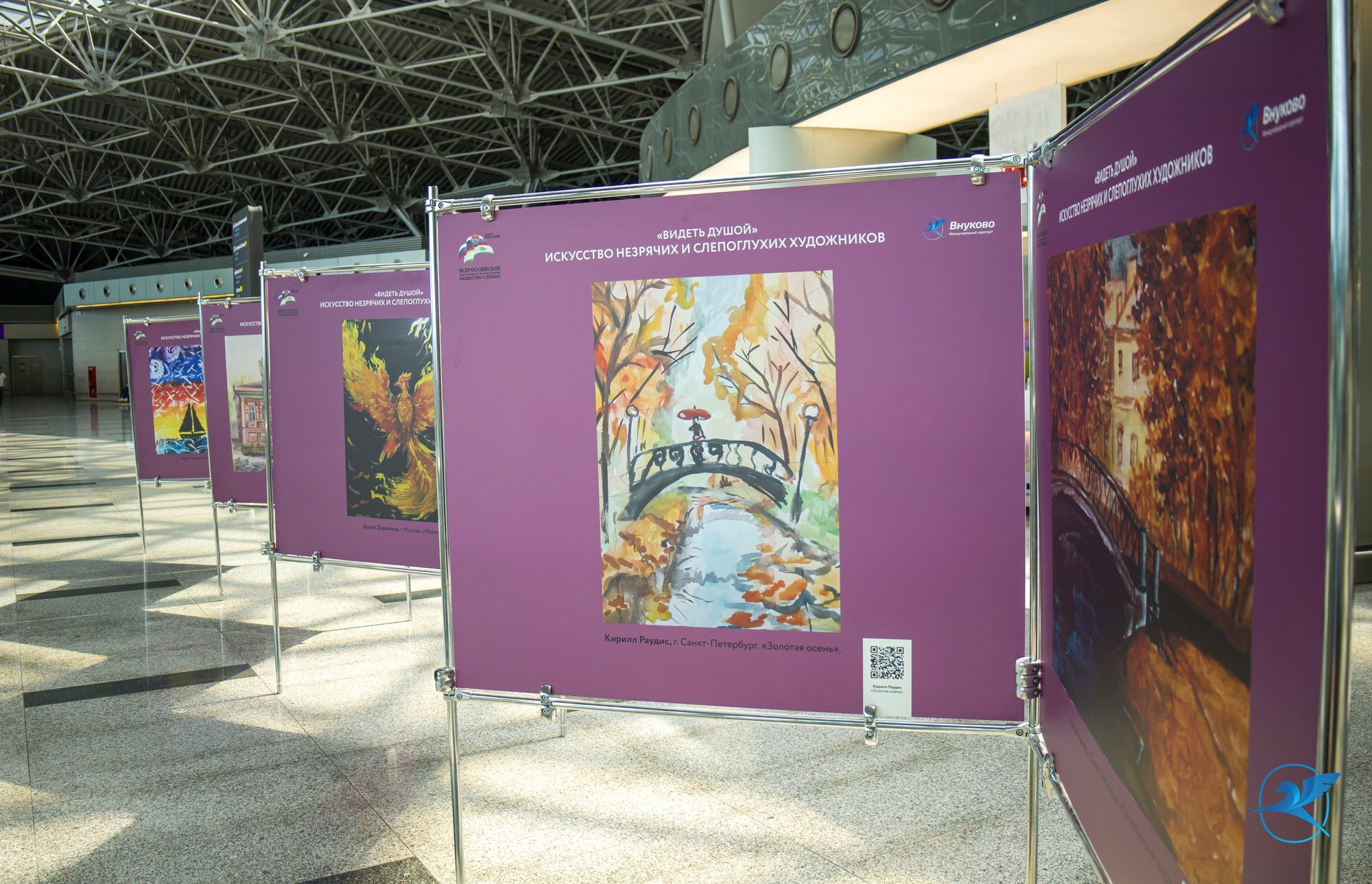 В Международном аэропорту Внуково открылась выставка «Видеть душой». Она представляет художественные работы талантливых незрячих и слепоглухих авторов со всей России, демонстрируя безграничные возможности творчества. Экспозиция приурочена к 100-летию Всероссийского ордена Трудового Красного Знамени общества слепых (ВОС).