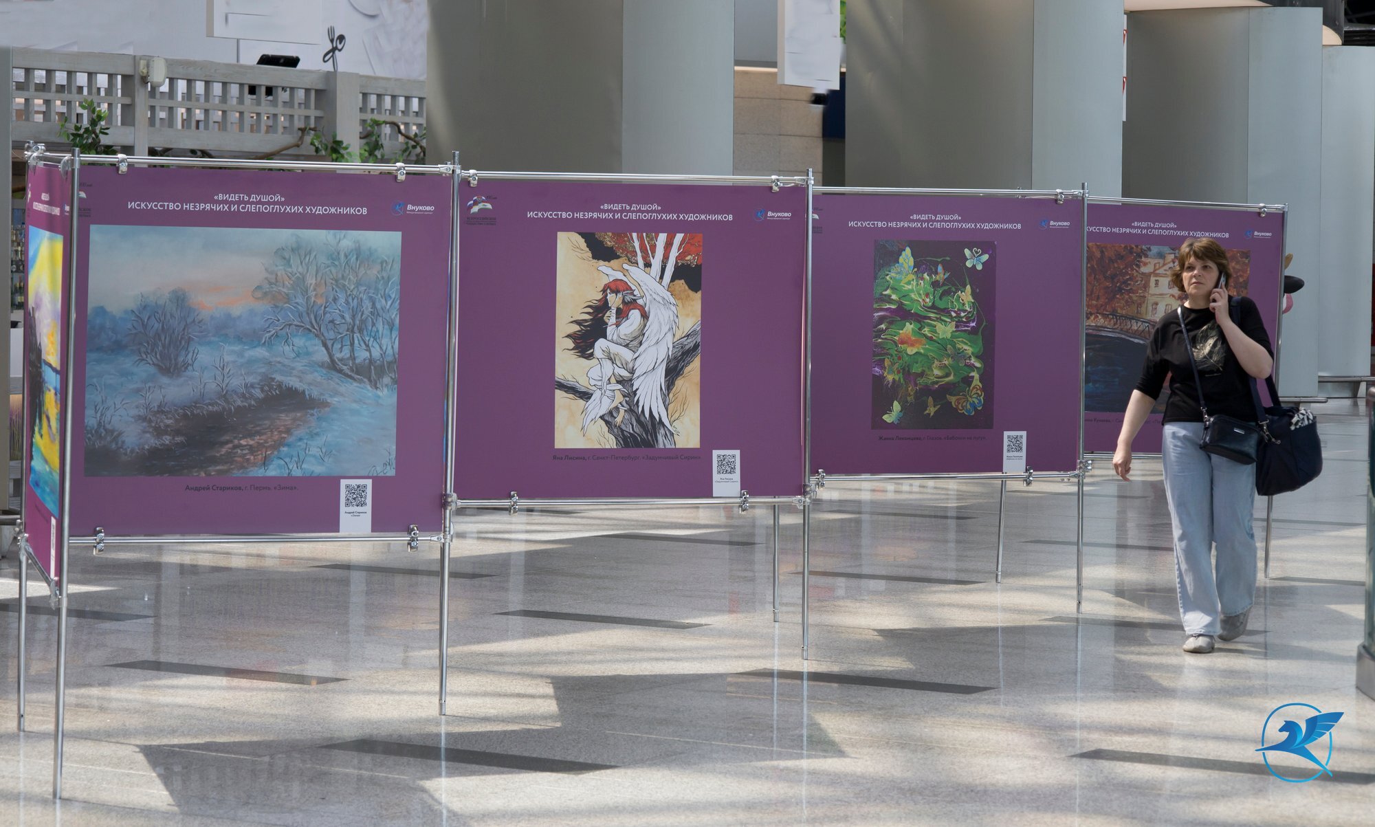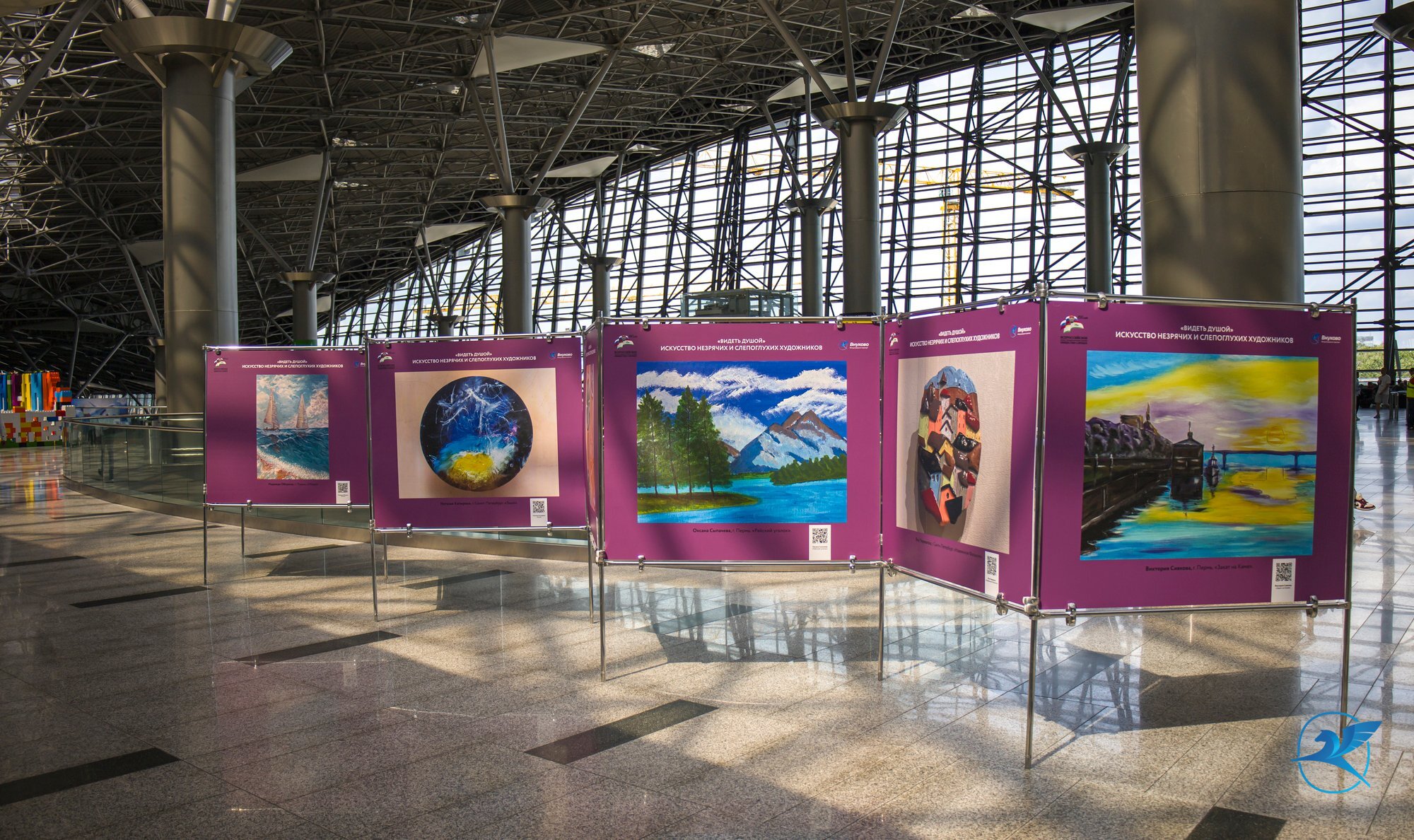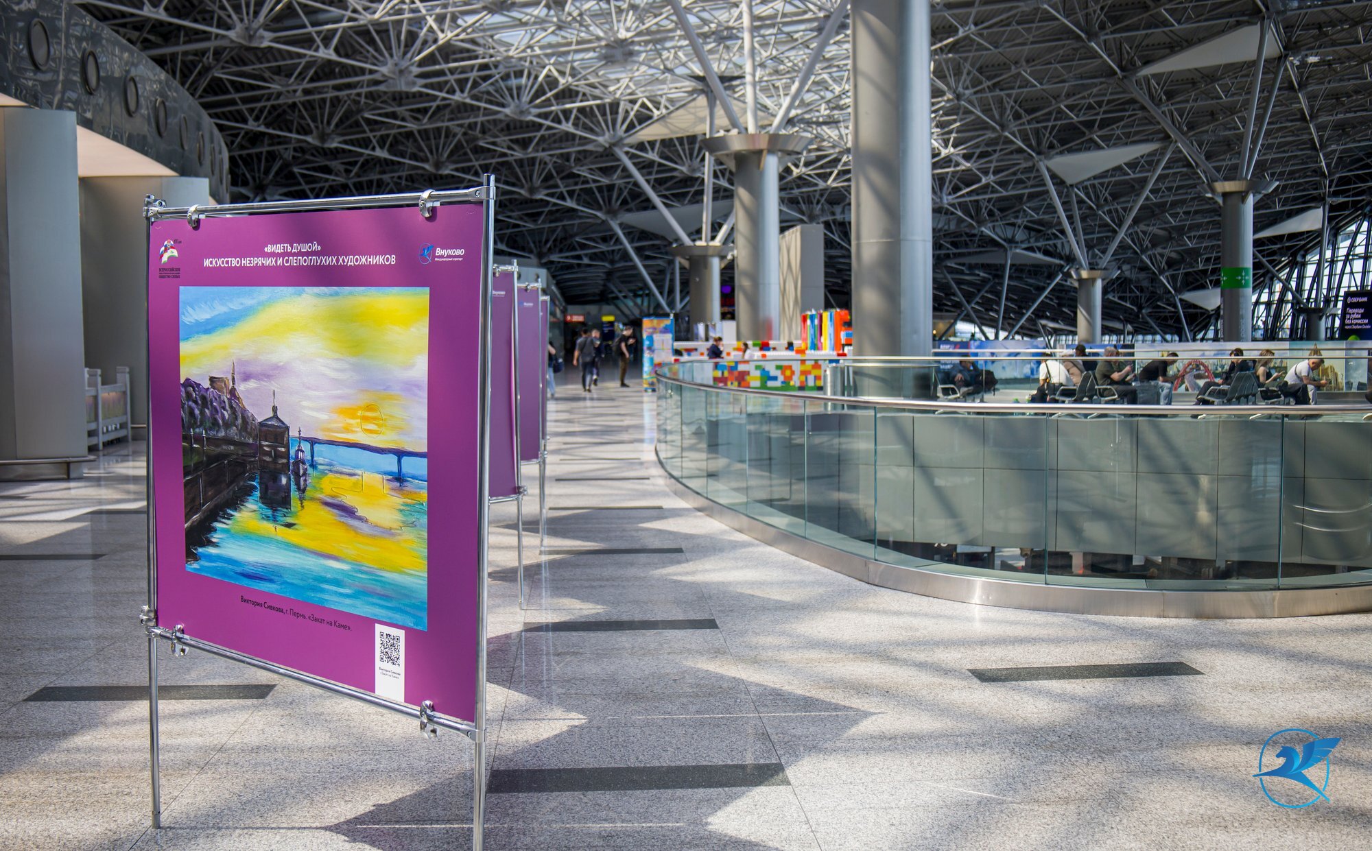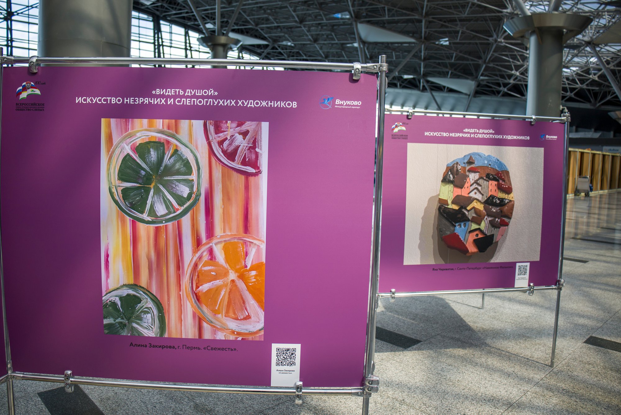 В Международном аэропорту Внуково открылась выставка «Видеть душой». Она представляет художественные работы талантливых незрячих и слепоглухих авторов со всей России, демонстрируя безграничные возможности творчества. Экспозиция приурочена к 100-летию Всероссийского ордена Трудового Красного Знамени общества слепых (ВОС).