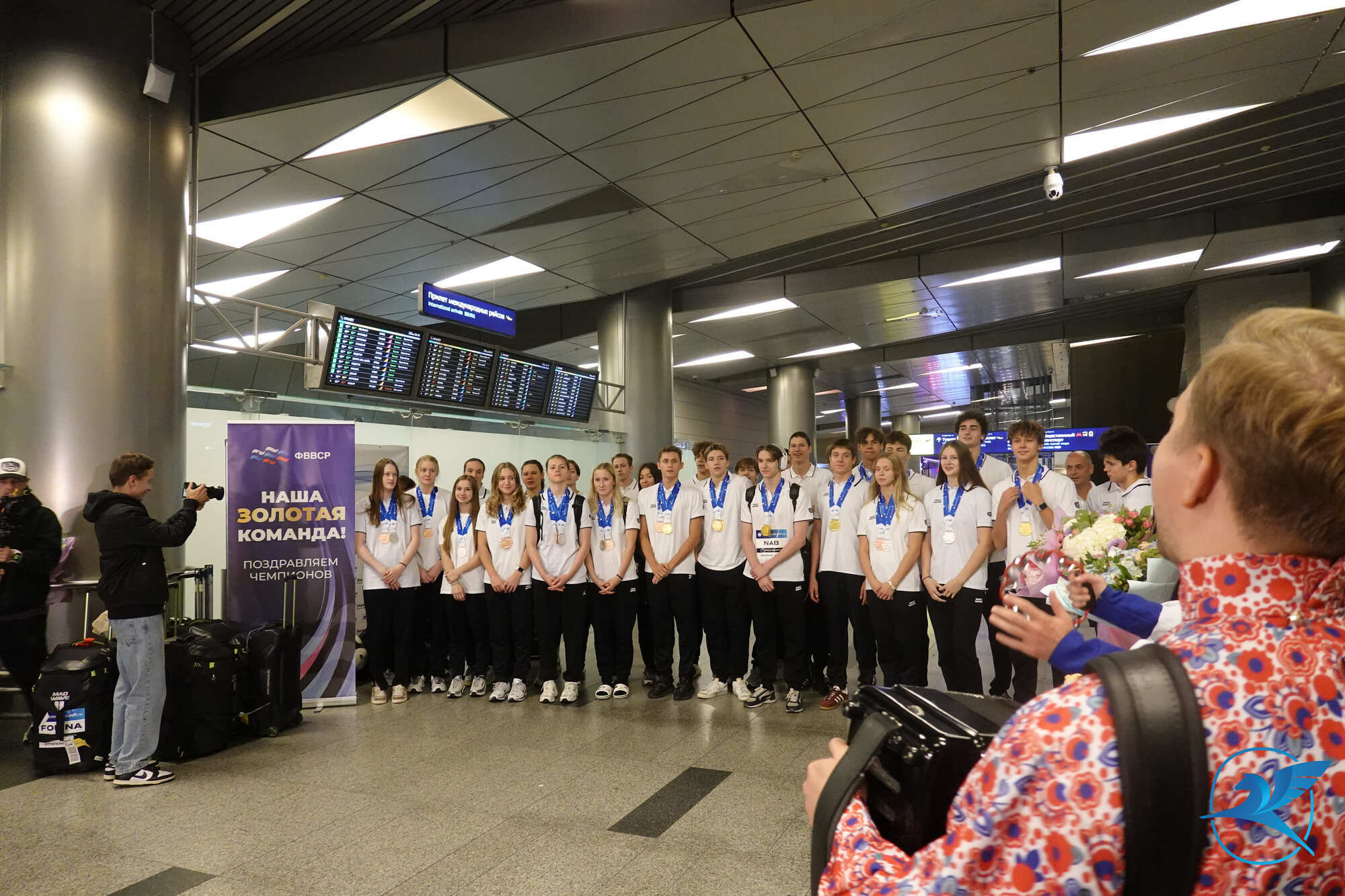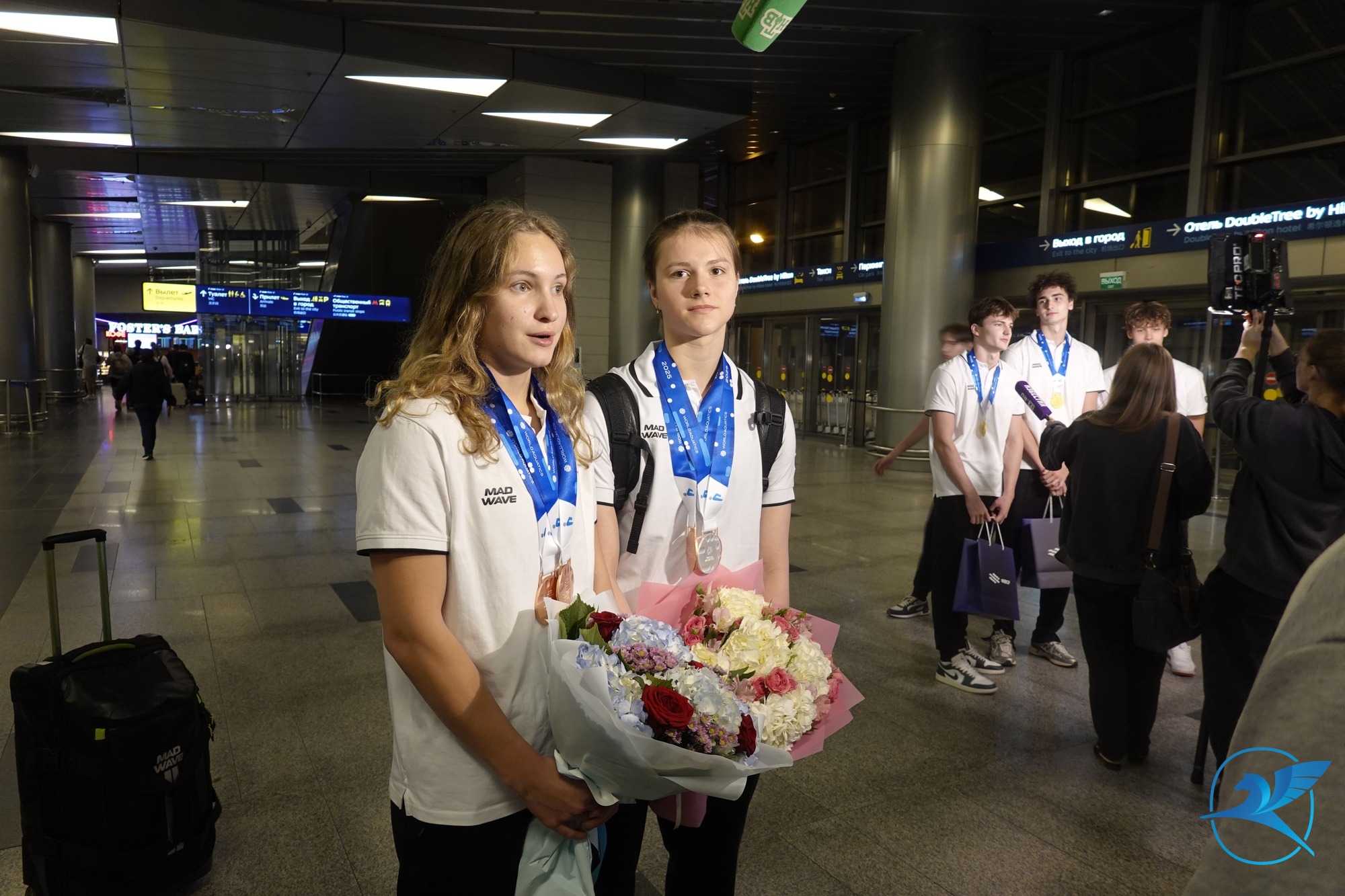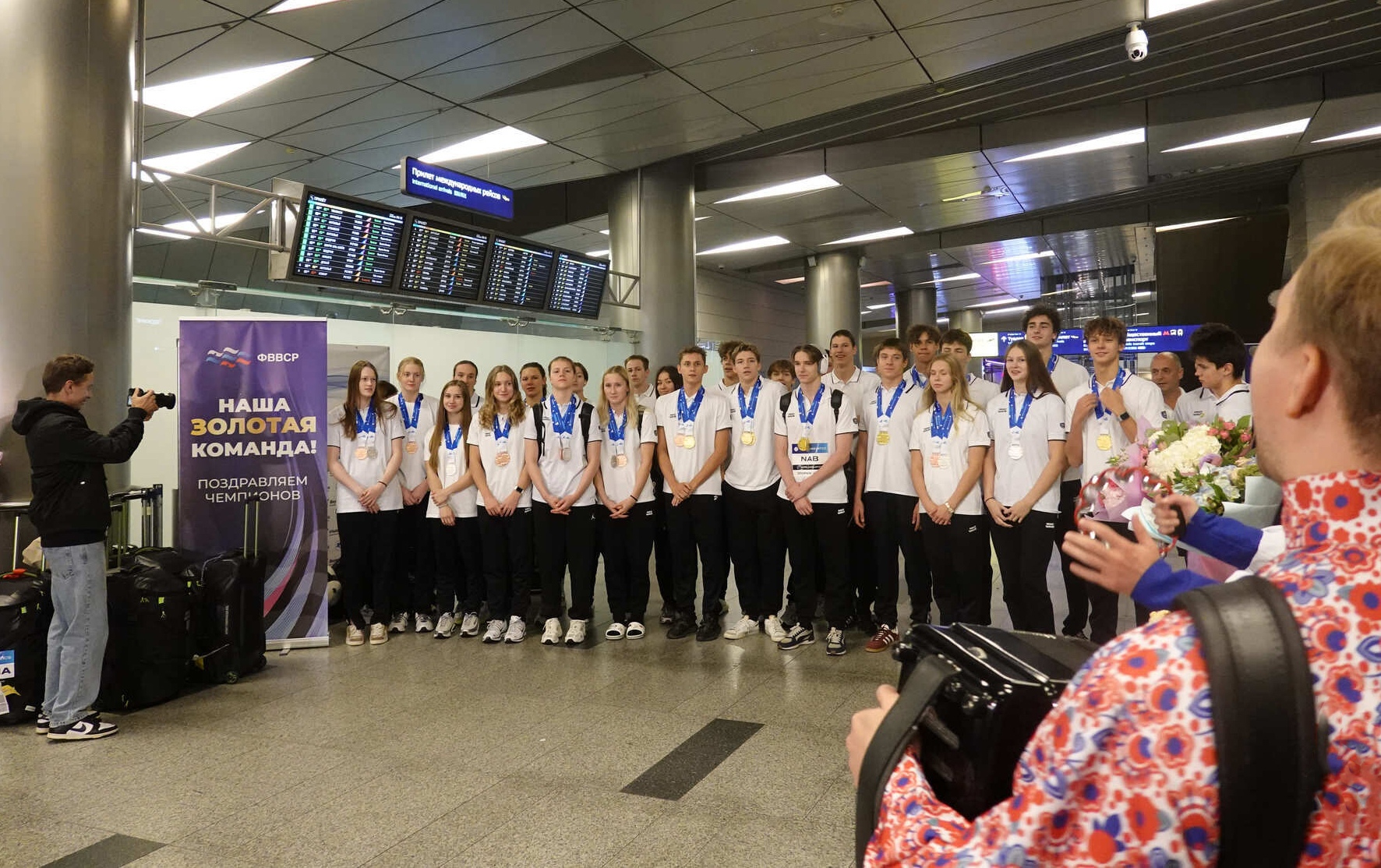 В Международном аэропорту Внуково с почетом встретили сборную России по плаванию среди юниоров, которая прилетела с первенства мира в румынском Отопени. Наши спортсмены показали выдающийся результат: завоевали в общей сложности 15 медалей, пять из которых золотые, установили два рекорда и в итоге заняли второе место в общекомандном медальном зачете, уступив только сборной США и обойдя бронзовых призеров чемпионата — команду Китая.