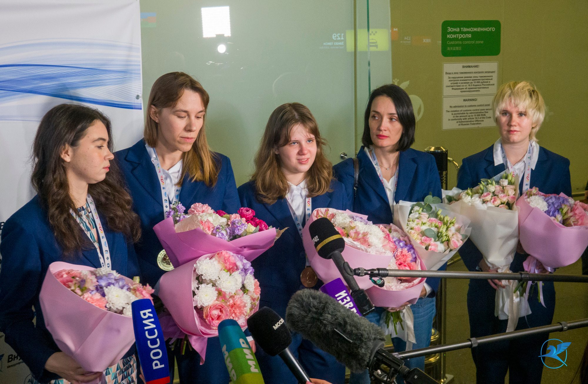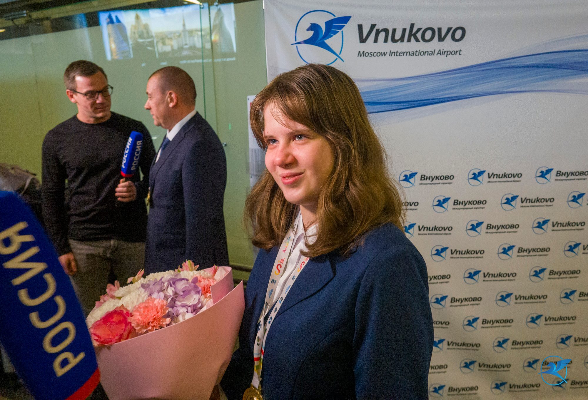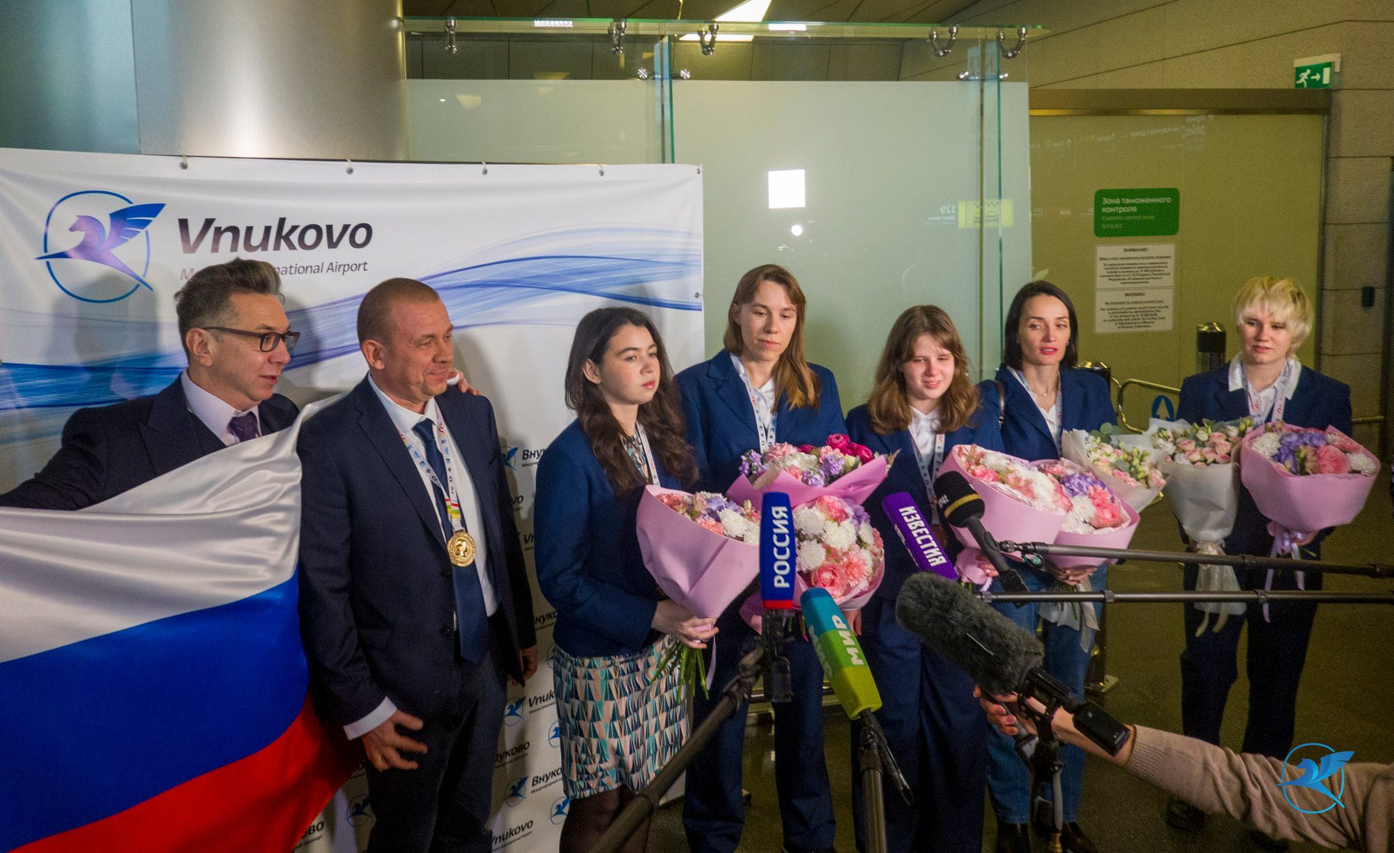 Российские шахматистки вернулись в аэропорт Внуково с командного чемпионата мира в Испании. Спортсменки вновь подтвердили своё превосходство, одержав 11 побед во всех 11 матчах турнира. Финальный поединок стал триумфом для нашей команды, которая уверенно обыграла азербайджанских соперниц.