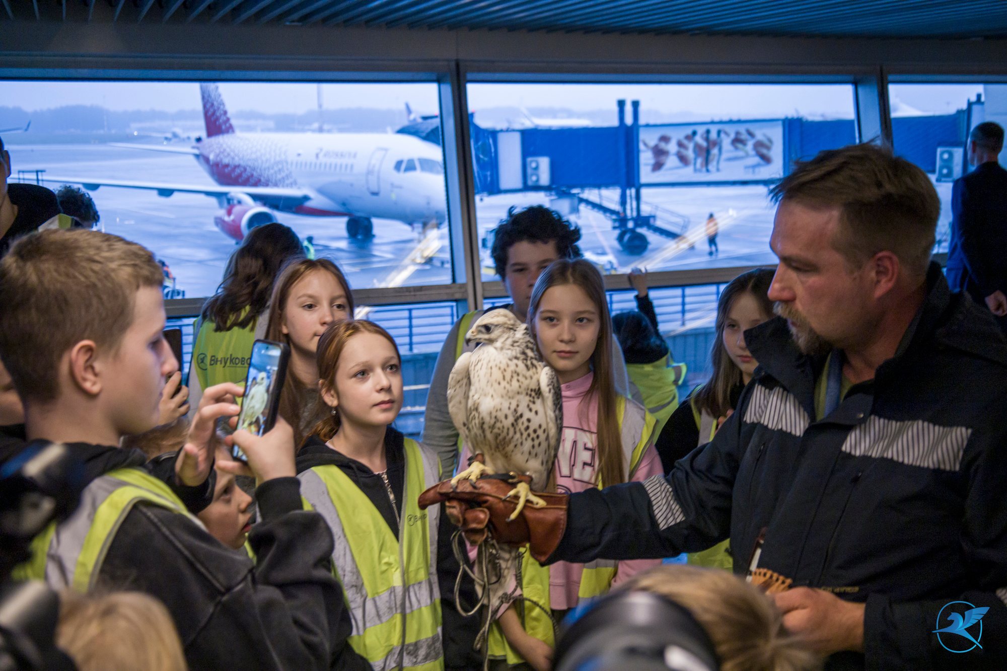 В трансферной зоне руководитель орнитологической службы аэропорта Дмитрий Ларин познакомил детей со своим пернатым помощником — ручным соколом, который несет службу по отпугиванию птиц с летного поля. Здесь же у ребят была возможность сделать фотографии на фоне перрона и взлетно-посадочной полосы. Завершилась экскурсия вручением памятных брендированных сувениров от аэропорта Внуково.