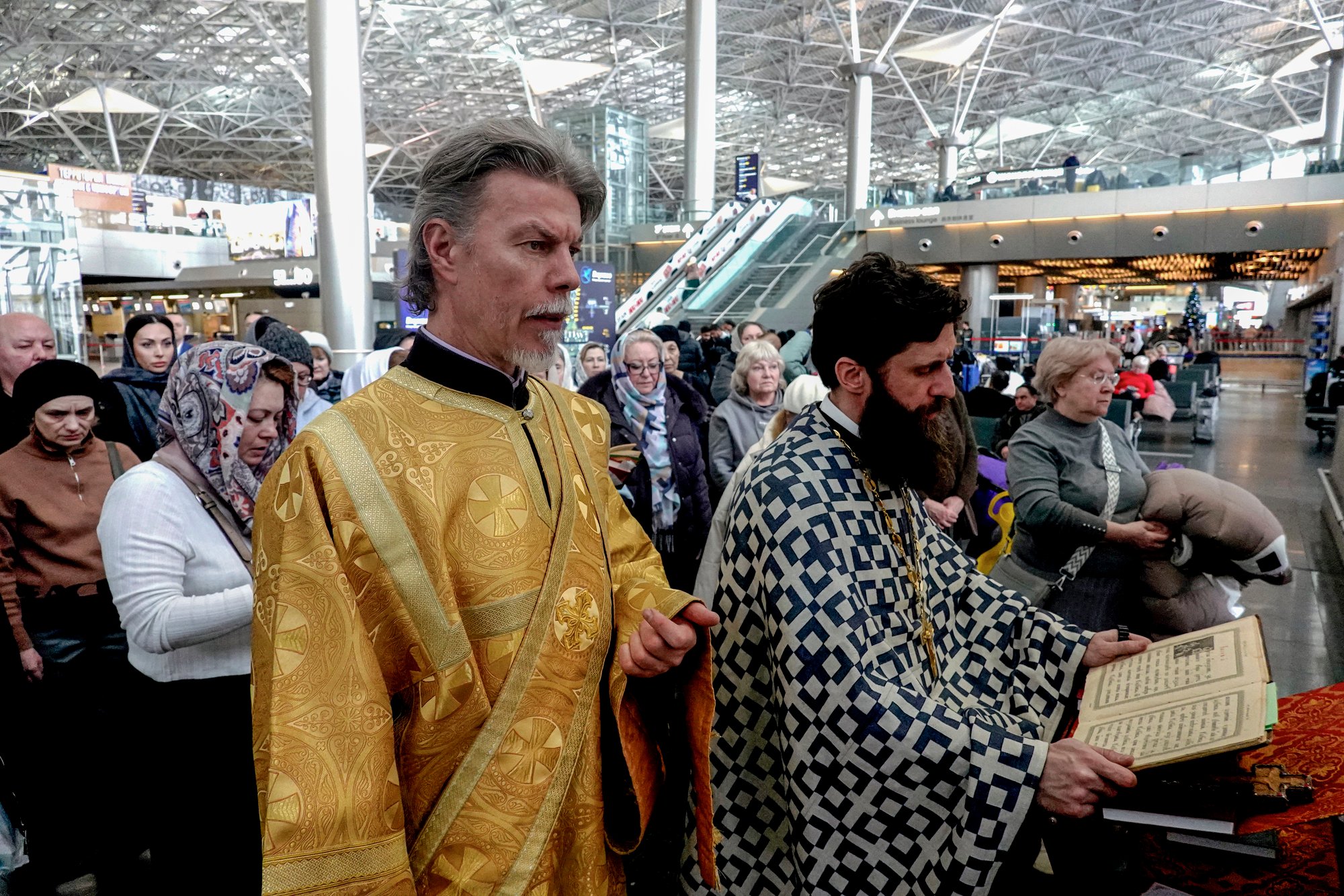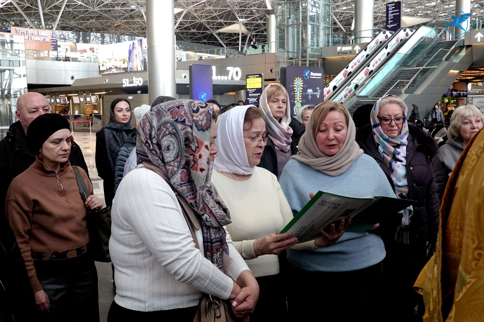 иерей Димитрий Бованенко совершил соборный молебен с акафистом Покрову Божией Матери, святому Архангелу Михаилу и святителю Николаю. На богослужение собрались сотрудники аэропорта, пассажиры и жители района Внуково, чтобы вместе обратиться к небесным покровителям. В общей молитвенной очереди к святыне стояли как сотрудники, так и руководство аэропорта.