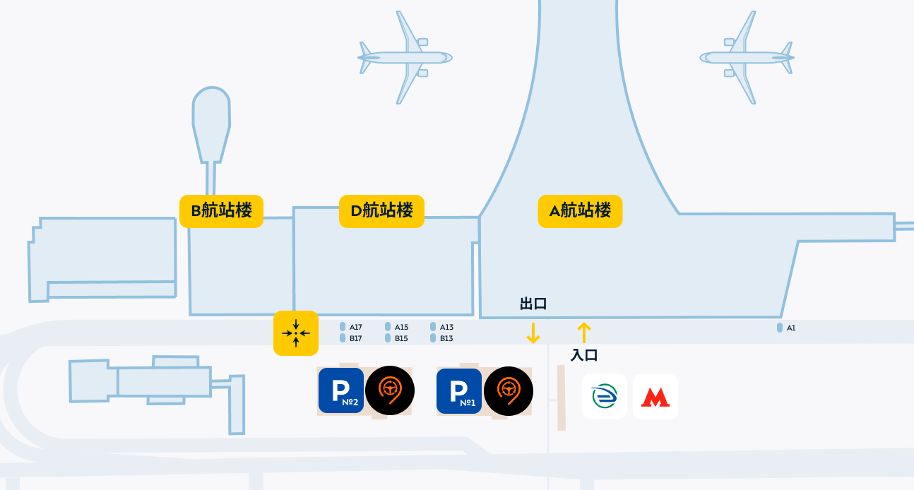 在 1 号、2 号多层停车场和航站楼A前的露天停车场