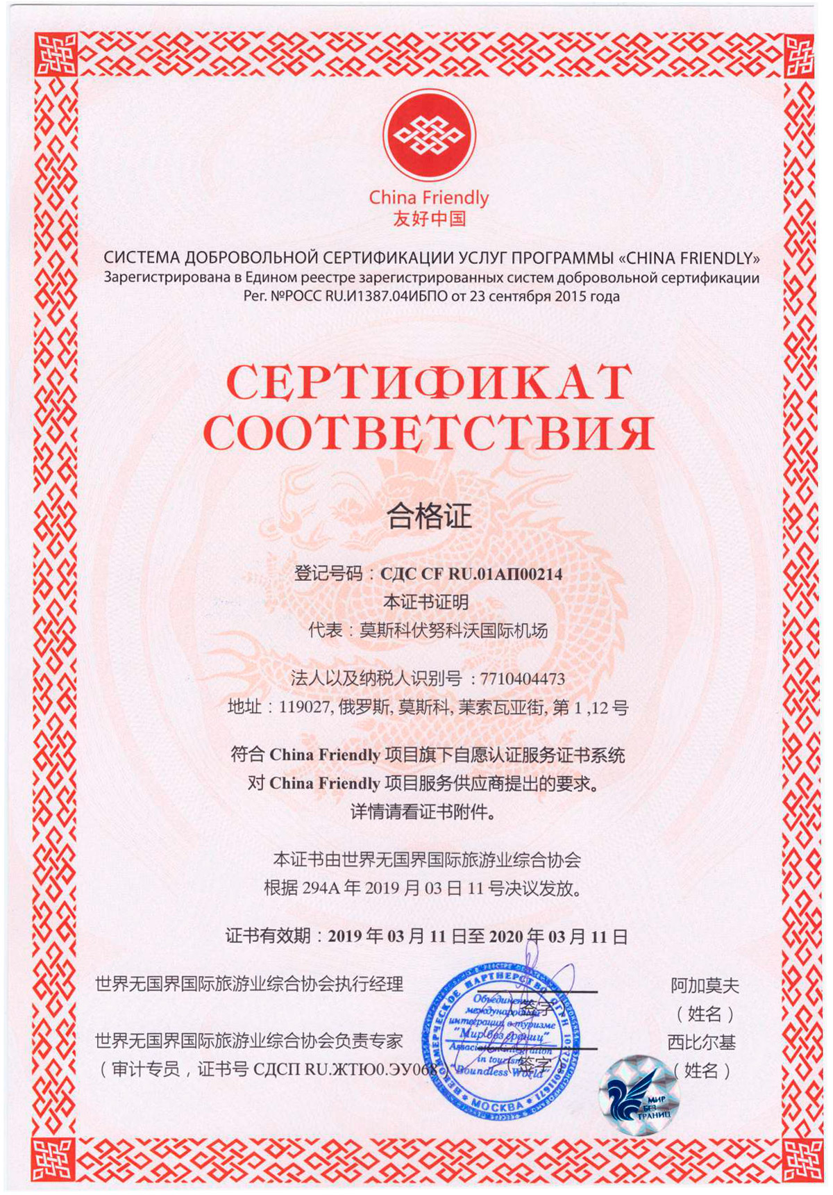 伏努科沃国际机场自 2019 年起加入了 «友好中国"计划,并获得了合规证书。该计划的主要目标是为中国的航空公司和乘客改造基础设施和服务技术。