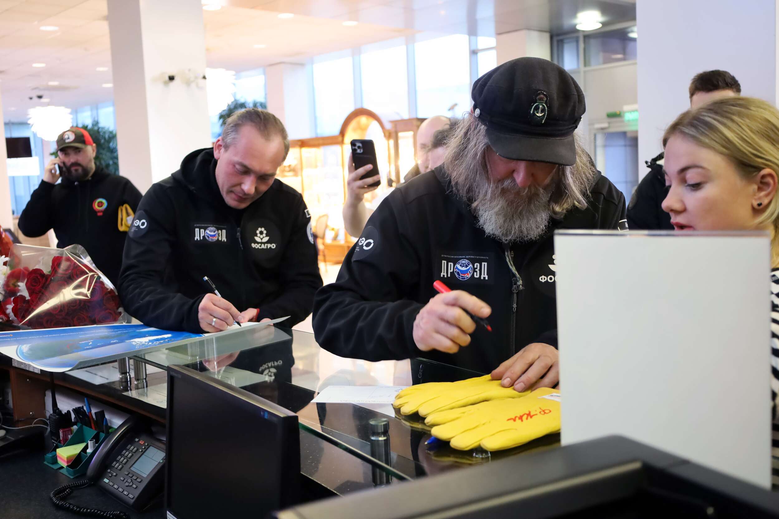伏努科沃3号商务航站楼举行盛大的欢迎仪式,迎接创造热气球最长不间断飞行世界纪录的探险家费奥多尔·科纽霍夫和伊万·梅尼亚伊洛。