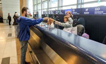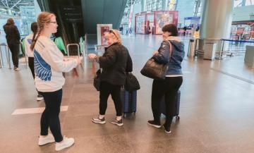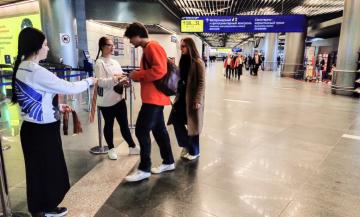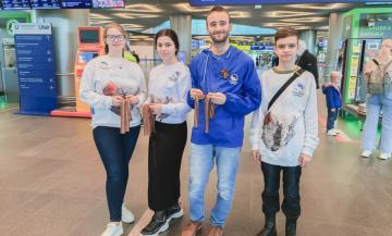 伏努科沃机场的员工和全俄社会行动“胜利志愿者”的代表向A航站楼的志愿者分发了圣乔治丝带。